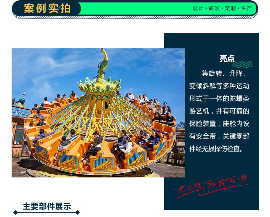 “孔雀開屏”是我公司開發的集旋轉、升降、變傾角等多種運動形式于一體的陀螺類免檢游藝機。當下傳動部件和中間轉塔錯位旋轉時,塔身徐徐上升,此時下傳動部件通過立柱搖動,座艙呈波浪漾狀,游客猶如在空中飛翔、飄蕩:海闊天空、驚心動魄,是標準的主題公園或現代游樂場的可選項目之一。 本游藝機設有可靠的保險裝置,座艙內設有安全帶,關鍵零部件經無損探傷檢查。
